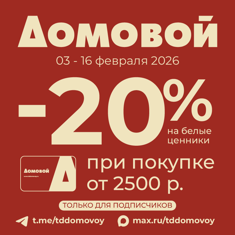 * Скидка действует с 03.02.2026г. по 16.02.2026 г. в розничных магазинах «Домовой» на белые ценники по купону с применением дисконтной карты «Домовой».