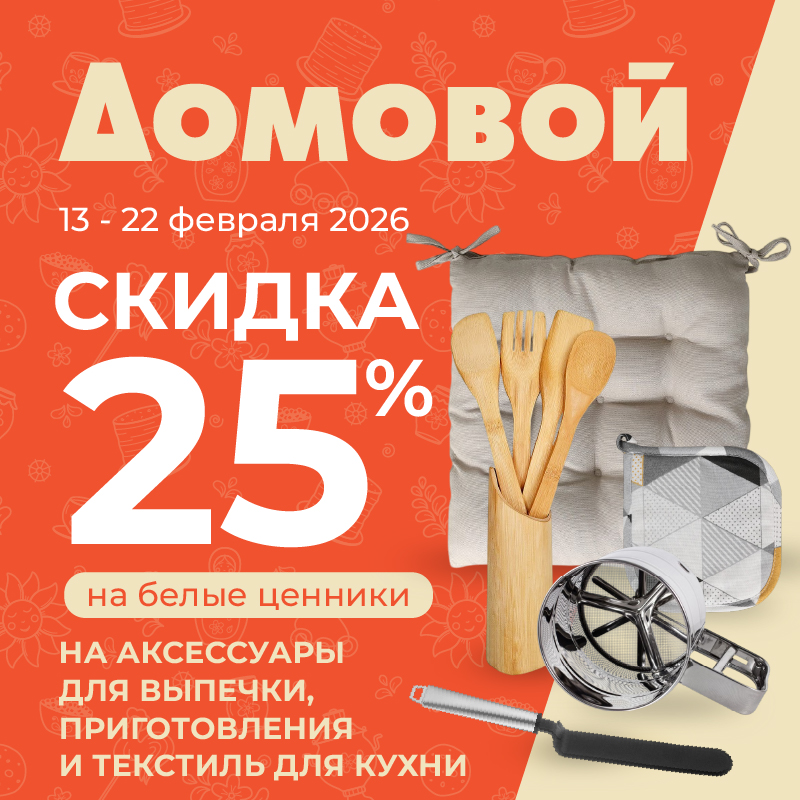 * Скидка действует с 13.02.2026г. по 22.02.2026 г. в розничных магазинах «Домовой» на белые ценники по купону с применением дисконтной карты «Домовой».